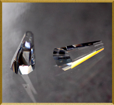 Chandeliar cut cubic zirconia. The stone is solid but gives the illusion that it is a hollow cone shape. There is a hole drilled into the top.